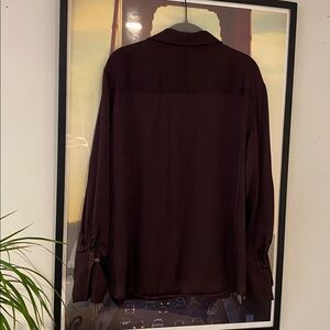 Size M chocolate brown button down shirt with satin effect . It’s relaxed boxy fit rather. No blemishes from smoke free home.