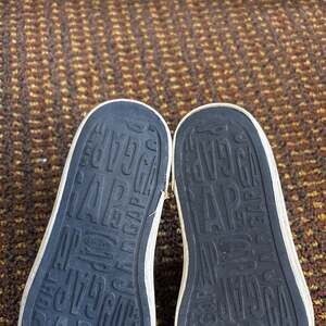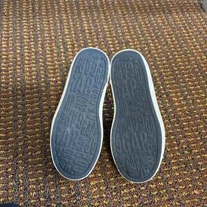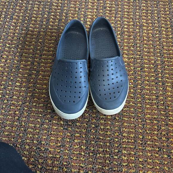 GAP rubber slip-on shoes in a dark color, perfect for casual wear or water activities. These shoes feature perforated uppers for breathability and a comfortable, easy-to-wear design. The soles are embossed with the GAP logo, indicating their authenticity. In good used condition with some wear visible on the soles, but still offer plenty of life. Ideal for everyday comfort and style. Smoke free, hypoallergenic dog friendly home.