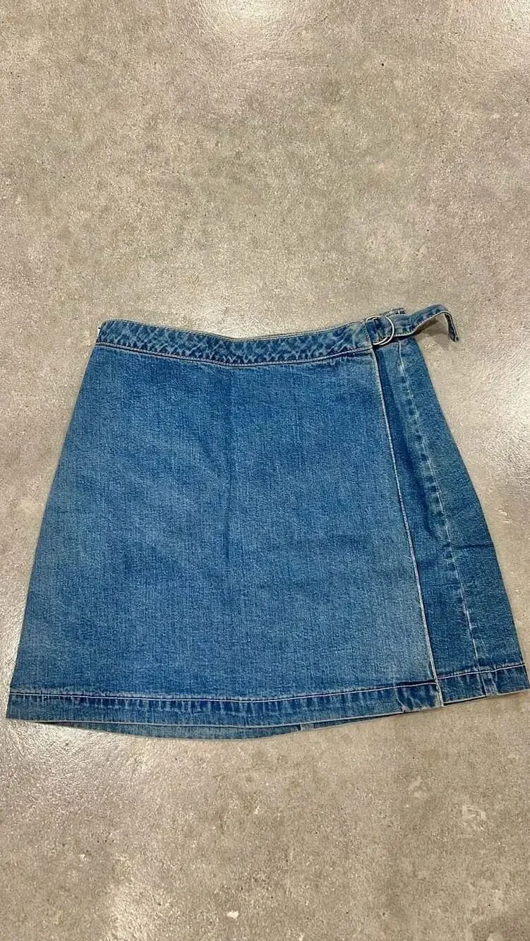 This classic denim piece features a unique wrap-around design with a silver-tone D-ring buckle closure and a single buttoned flap back pocket. Comfortable and versatile, it's a perfect staple for casual, everyday wear or a Y2K-inspired look.
