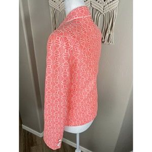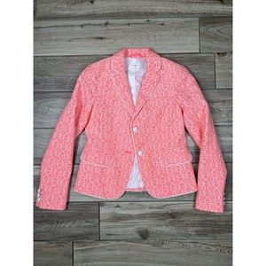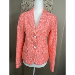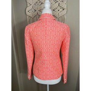 Description: Gorgeous and unique bright coral/ Pink and white preppy blazer. Geometric design, white trim and white metal carved buttons gives this blazer an elevated polished & stylish look. Materials: Shell - 56% Cotton, 20% Polyester, 18% Nylon / Lining - 100% Polyester Womens Size: 0 Approximate Measurements Lying Flat: Pit to Pit- 16 Length Shoulder to bottom hem- 22 Condition: Excellent Pre-Owned Condition. No major flaws noted. ALL ITEMS COME FROM A SMOKE-FREE HOME **THANKS FOR LOOKING** We ship MONDAY thru FRIDAY.