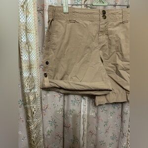 This is a pair of Gap adjustable length flat front pocket utility shorts in size 6. These beige shorts are designed for women and feature a lightweight construction with convenient pockets and adjustable length. Perfect for a casual and versatile look, these shorts are great for everyday wear. They are pre-owned, but in great condition!
