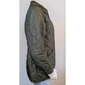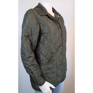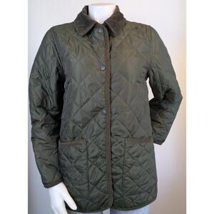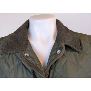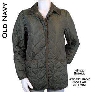 Gap quilted barn-style jacket with corduroy collar and trim in size small. Snap front closure with hidden zipper placket look, two front patch pockets with corduroy piping, and lightweight polyester fill for everyday warmth. Classic quilt pattern in olive green with tonal trim, ideal for fall layering and countryside inspired outerwear. Excellent condition without notable flaws. Approximate measurements are below. 2 day shipping!
