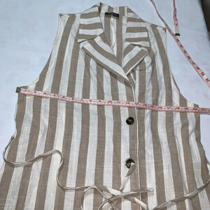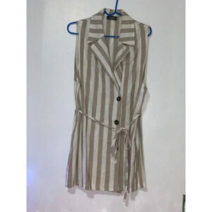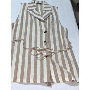 Elegant sleeveless top with beige and white stripes. Features a tie waist and button accents. wear a turtleneck and leggings for winter. A classy outfit!