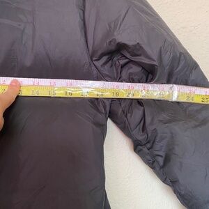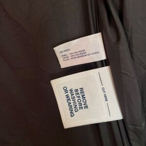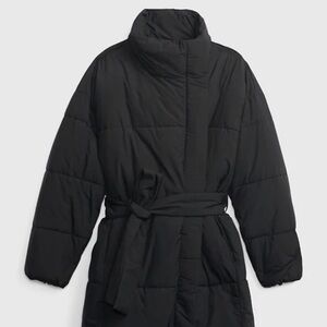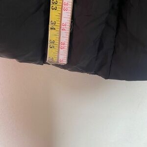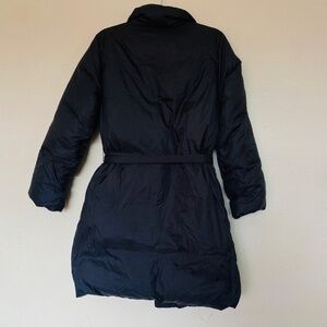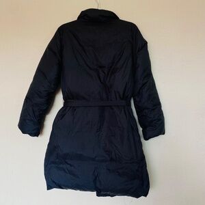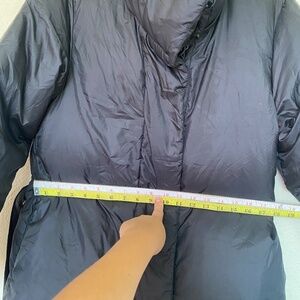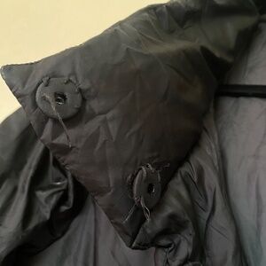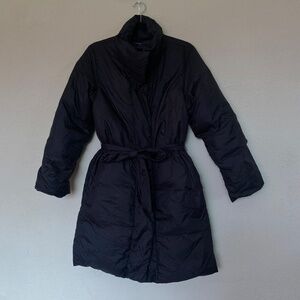 Stylish black puffer jacket. Belted waist. Warm and comfortable. A few of the buttons have been resewn but could be redone if you want to use them. I didn’t use the buttons much