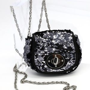 GAP black sequined evening purse with long silver chain strap. Excellent condition. Purple fabric interior.