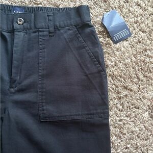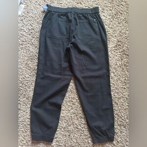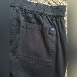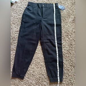 Stylish black track pants. Elastic cuffs. Front pockets. Comfortable fit.