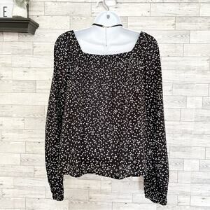 Look chic in this Gap black top with a trendy white square "dot" print. It has a flattering square neck and long sleeves with cute gathered elastic cuffs. You can wear it tucked in, like in the cover image, for a polished look, or let it flow loosely for a more relaxed vibe. Made of comfortable cotton/rayon blend, it's easy to care for—just toss it in the washing machine!