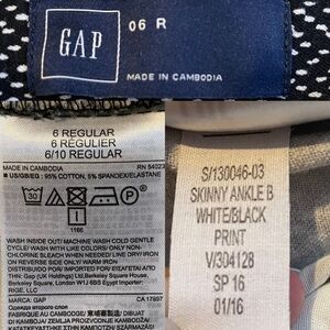 GAP black and white skinny ankle pants in size 6. Pre-owned in good condition. The front pockets have zippers, and there are faux back pockets.
