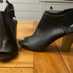Chic black peep-toe booties. Ideal for versatile styling. Comfortable and trendy.
