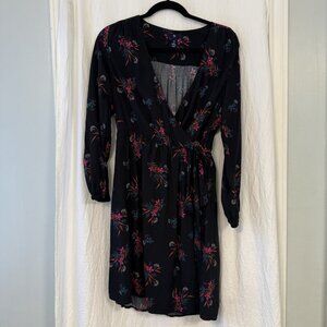 GAP Black Wrap Dress With Pink Floral Print Long Sleeve Size Small Church
