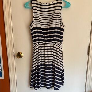 This casual mini sundress from GAP features a chic black and white color scheme with a flattering v-neckline. Its sleeveless design and lightweight fabric make it perfect for warm weather outings, offering both comfort and style. It has pockets! Some wear on inside neckline.