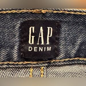 These GAP best girlfriend 1969 jeans feature a classic blue hue with stylish distressed details, including prominent rips at the knees. The relaxed fit and subtle fading give them a trendy, lived-in look perfect for casual outings.