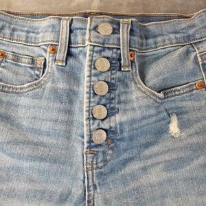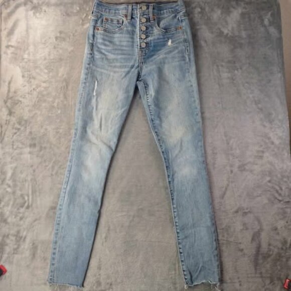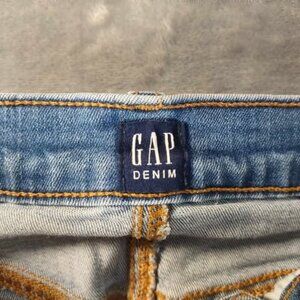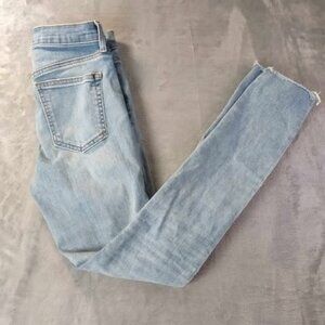 Flattering and versatile high rise skinny jeans from GAP, size 26. Light indigo wash with subtle distressing and raw hem for a modern, worn-in look. Features a button fly closure, classic five-pocket design, and a stretchy cotton blend (93% cotton, 5% polyester, 2% spandex) for comfort and movement. Style code S1402916-00. Great everyday denim with a little edge.