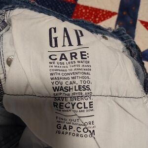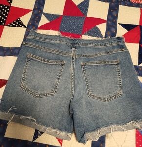 These GAP blue jeans girl friend mid rise shorts size 28/6R, feature a stylish distressed look with frayed hem edges, perfect for a casual summer vibe. Crafted from traditional denim, they offer a comfortable fit with a relaxed, lived-in appearance. Ideal for laid-back outings, these shorts are a must-have for your warm-weather wardrobe.
