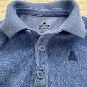 Soft blue bodysuit with collar. Short sleeves. Button closure.