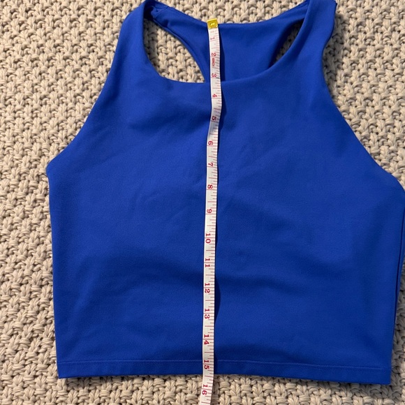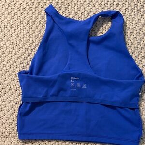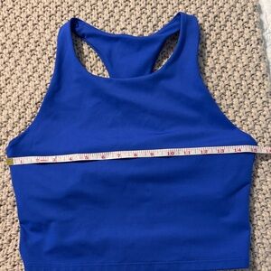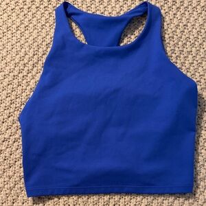 Stylish blue racerback sports bra. Ideal for workouts. Comfortable and supportive.