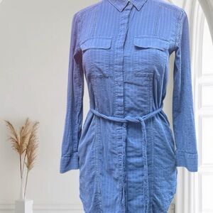 Stylish blue shirt dress. Features long sleeves and a tie waist. Perfect for casual outings.