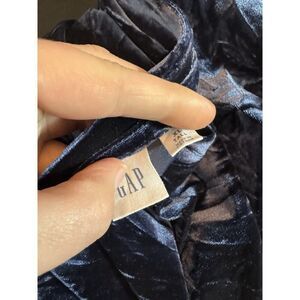 This is a GAP blouse in blue velvet fabric with a round neckline and short sleeves. The top is inspired by vintage styles, giving off a whimsical and clean girl look. It is a casual piece suitable for travel, parties, work, or everyday wear. The blouse is a regular fit in size L, made of a polyester-spandex blend for comfort and stretch. It features a collarless design, is lightweight, easy to care for, and suitable for all seasons.