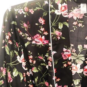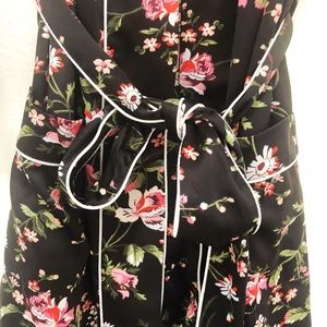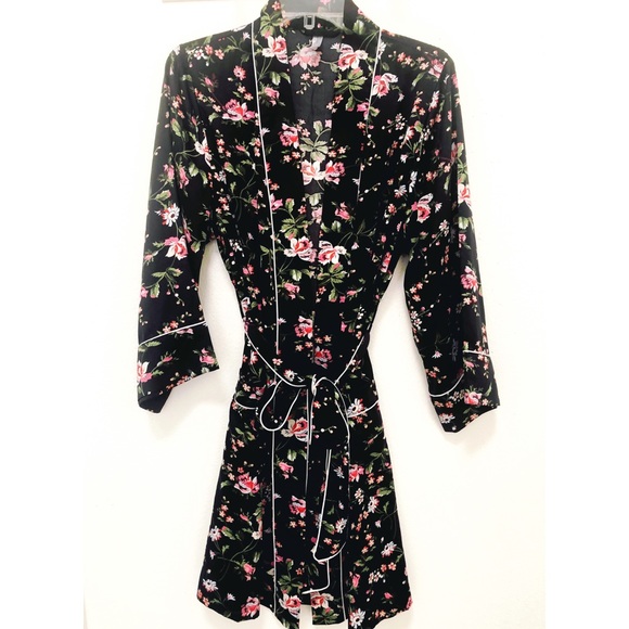 Beautiful flower pattern robe with white piping detail along the sleeve, pockets and belt.