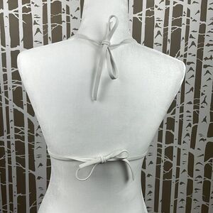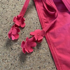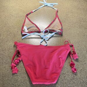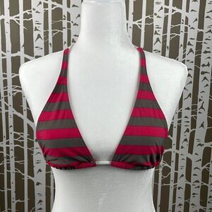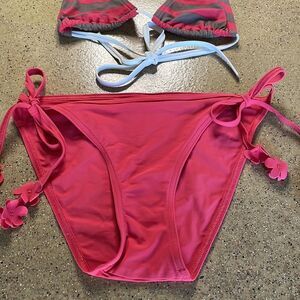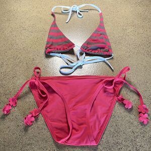 GAP Body pink and tan striped bikini with floral accents. Triangle top is size S, Bottoms are size M. Top is tan and pink striped with white ties and doesn't have any padding or pockets for padding. Bottoms feature adjustable side ties with cute floral accents on the ends of the ties. GAP Body fabric is very soft and stretchy. Clean and free of flaws.