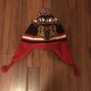 In Good Condition Gap Toddler Boy Size M/L (runs small) Black and Red Fleece Trapper Hat with a Picture of a Bear and Grizzlies Written Across the Front