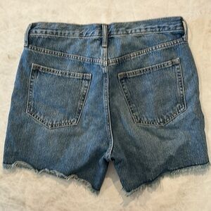 Cut offs, with distressing. 100% cotton. Button and zipper. 5” inseam.