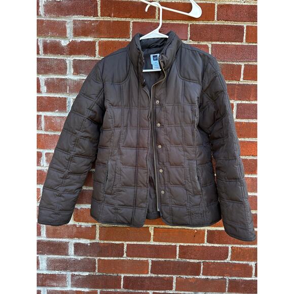 Classic quilted puffer from GAP in a deep brown that legit goes with everything. Lightweight but warm, easy everyday winter layer. Zip and snap front, pockets, clean lines. No holes or tears, just a little normal wear. Such a good staple if you’re into cozy, neutral basics.