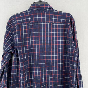 GAP Button Up Shirt Mens Sz L Navy Blue Red Plaid Standard Fit Collared Pockets