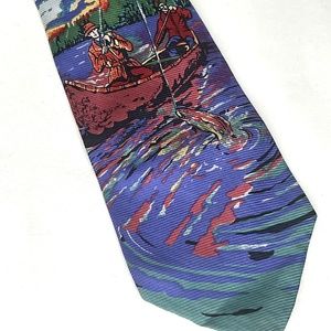 Printed on this tie is a serene scene of men in a canoe on a lake fishing on a green background. Made by Gap in the United States, it is 100% silk. Worn several times, it has no stains or snags...good condition. Measures 58.5" long, 4" wide at the base.