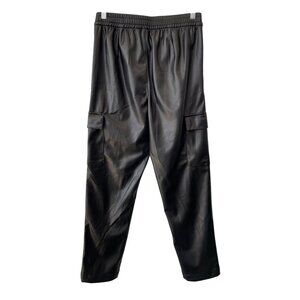 High-rise black cargo pants featuring faux leather material, two slash pockets, and cargo flap pockets for added utility. Designed for style and comfort in a tall fit.