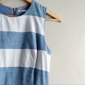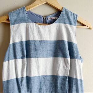 Chambray Indigo Stripe Dress by GAP, featuring a sleeveless fit & flare silhouette, pockets, 100% cotton chambray material, wide indigo blue and white wide horizontal stripes, back zipper closure, short length. Fully lined.