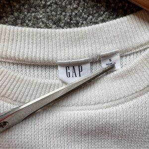 Preppy and classic white knit sweater from GAP. Orange stripes and buttons on the shoulders. Curved hemline. 100% cotton