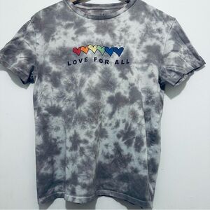 GAP Collective gray tie-dye t-shirt with colorful heart design and 'Love For All' on front and heart on back shoulder. Teen Size 14-16. Preowned good condition: no rips, flaws, stains, tears, etc. slight wear on graphics