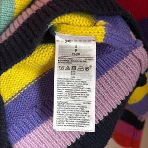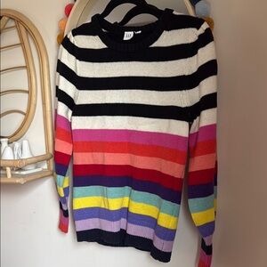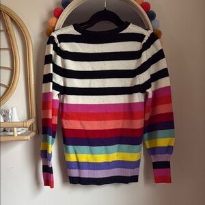 Brighten your wardrobe with this colorful striped sweater. Featuring a vibrant mix of black, white, red, pink, orange, yellow, green, blue, and purple stripes, this sweater is perfect for adding a pop of color to any outfit.