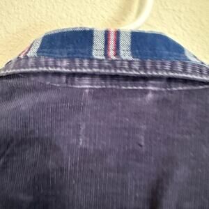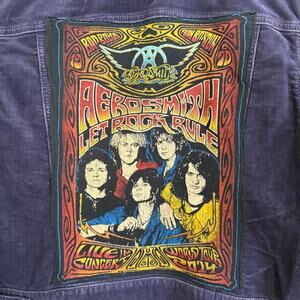 EUC is a Gap corduroy trucker jacket that has been upcycled with an Aerosmith Tee on back and flannel shirt sleeves.
