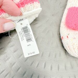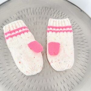 These GAP mittens are crafted from a thick, warm knit in a classic white hue, accented with charming pink stripes near the cuffs. Designed to keep your hands snug during cold weather, they are an essential accessory for any winter ensemble.