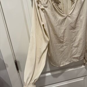 Lightweight cream blouse with ruffle trim at the neckline and shoulders. V-neck silhouette for a soft, feminine look. Long sleeves finished with elastic cuffs. Smooth drape suitable for casual or dressed-up outfits.