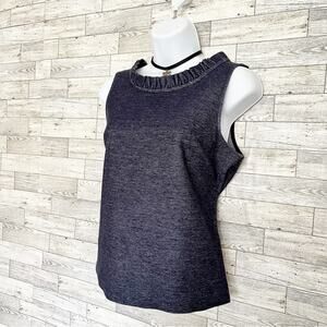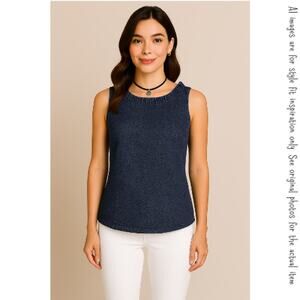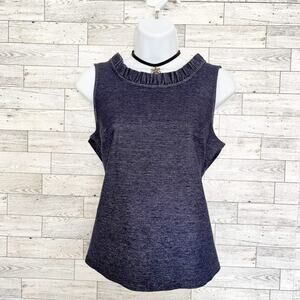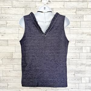 Elevate your style with the GAP Dark Blue Denim Sleeveless V-Back Top, brand new with tags, and available in size S. Whether it's a workday or a weekend outing, this versatile top has you covered. The dark blue stretchy denim exudes comfort and chic. Its round neck and V-back neckline with all-around ruffle trim add a touch of elegance. Not to mention, the bust darts provide a structured and flattering fit. Crafted from a blend of cotton and spandex, this top ensures a comfortable and flexible wear. Easily maintain its charm with a simple machine wash. A must-have addition to your wardrobe!