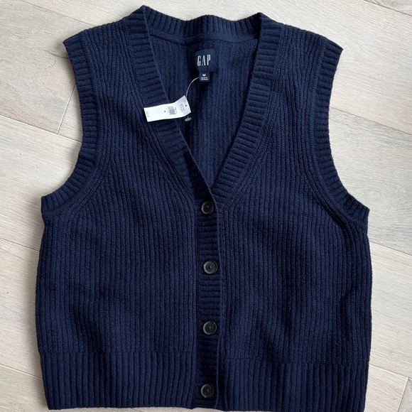 Classic dark blue vest by GAP. Features ribbed knit and button closure.