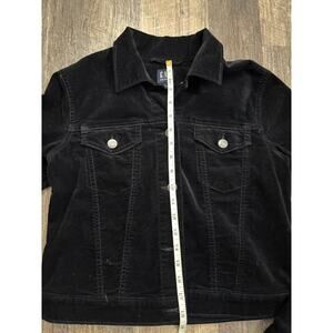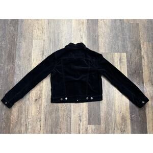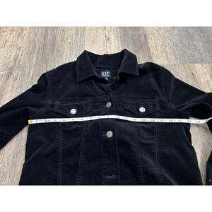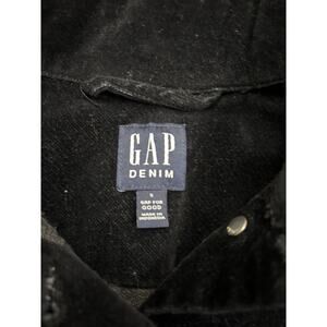 This is a black velour feeling jacket from GAP Denim, featuring a classic button-up front and two chest pockets. The jacket is designed for casual wear, suitable for layering in cooler weather. It is a size small and is in excellent used condition.