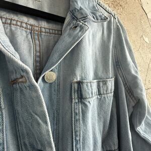 Gap 1969 lightwash denim jacket with utility-inspired details. Women’s size Medium in 100% cotton for a soft, breathable finish. Features button-front closure, chest flap pockets, and an adjustable tie-waist for shape and versatility. Can be styled as a lightweight jacket or worn as a shirt. A classic wardrobe staple with modern utility edge.