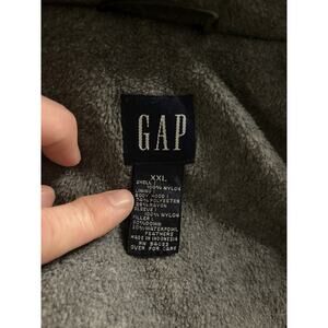 Stay warm and stylish with this GAP XXL hooded down puffer jacket in classic olive green. Features a quilted nylon shell, full zip front, and cozy fleece-lined hood and body. The down and feather insulation provides exceptional warmth without excess bulk — perfect for winter weather, travel, or outdoor adventures.