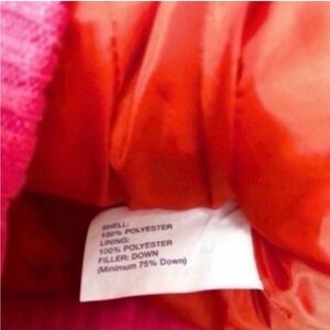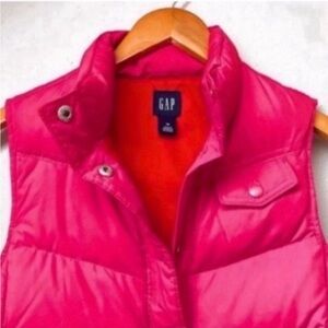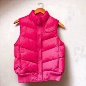 Quilted puffer vest with snap button closure and two pockets plus front patch pocket. Pink exterior with orange lining. Excellent pre-loved condition. Barbie/Barbiecore vibes.