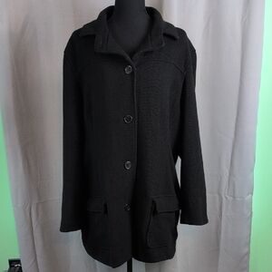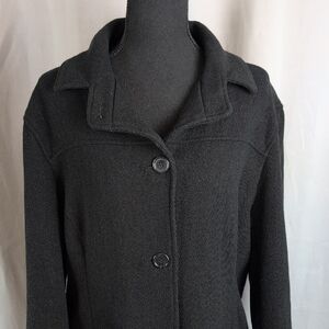 Sophisticated black pea coat with button closure. Features front pockets for convenience.