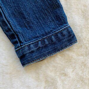 This Gap kids denim jacket in a dark wash is a stylish and versatile outerwear option for girls size M (7/8). Made from a comfortable cotton blend (99% cotton 1% spandex), this short-length jacket features a solid blue color and a classic button closure. Features pink thread at the button holes. The modern yet American-inspired design makes it a timeless piece for any young fashionista's wardrobe, perfect for layering during the warmer months or cooler days. Approximate measurements laid flat: Pit to Pit: 13.5 inches Length: 16 inches Arm Length: 20.5 inches In excellent condition. Dated spring 2010. Pictures are part of the description. From a smoke-free home. No trades please.