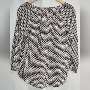The material tag is missing but the fabric feels like a lightweight cotton, elastic cuffs, 3/4 sleeves, v-neck, work, office, business casual, lunch date, brunch