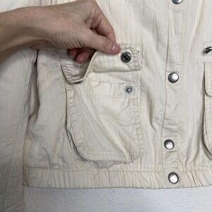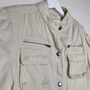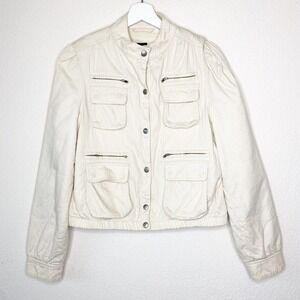 Great jacket almost coat by GAP. Thicker bomber style jacket in a shade of cream with a ribbed texture. Slight puff and ruching in the shoulders. Multiple pockets also give the appearance of a utility jacket. 8 pockets with zip and snap closure. Sleeve cuffs and jacket also have snap closures. Elastic waist band. Soft fleece lined. Great go to piece with a lot of style and versatility! PLEASE NOTE: Some spots as seen in last pic. May come out with a professional washing. All measurements are approximate, taken flat and closed.