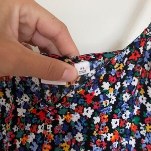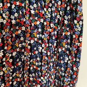 Floral slip dress by GAP. Black background with cottage core flower pattern throughout in white, red, blue, orange, green. Adjustable spaghetti straps, slight v-neck, two side pockets, maxi length, and breezy fit. Perfect piece for summer!