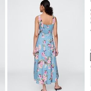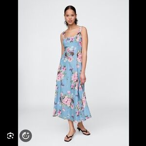 Floral square-next maxi dress by GAP. Medium blue background with pink flower print throughout, soft linen-blend, square neckline, sleeveless, tank straps, smocked back, and side zipper with hook-and-eye closure. Like new condition!