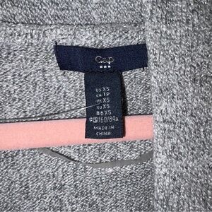 This GAP cardigan sweater vest in a soft gray hue features a long, open-front design with a shawl collar, offering a relaxed and comfortable fit. Crafted from a cozy knit material, it drapes elegantly below the hips, making it a versatile layering piece for any occasion.